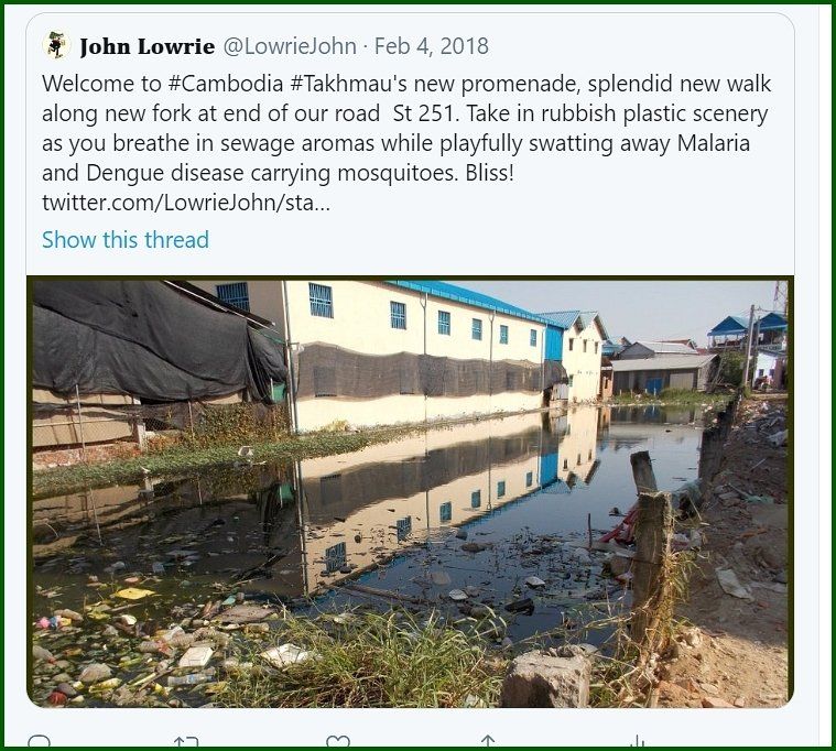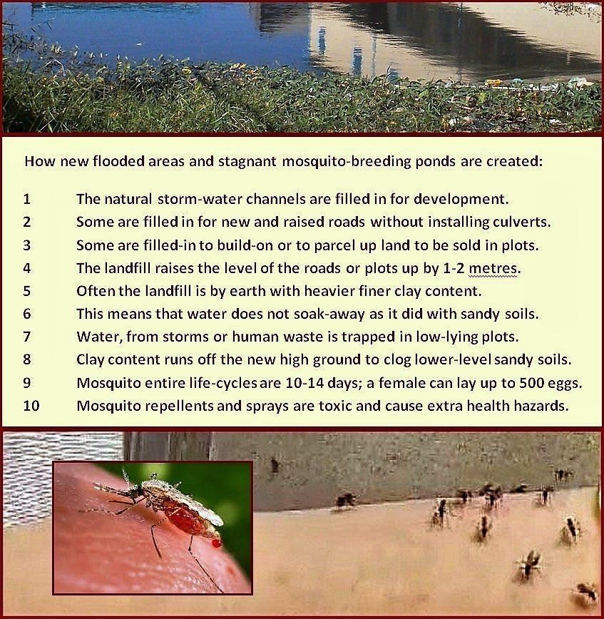 Phnom Penh and other urban areas have experienced vast construction developments over the last 10 years. The city is built on the low-lying flood plain of the River Mekong at the confluence of the Tonle Sap and Tonle Bassac tributaries. Almost everywhere new roads and building sites are land-filled to raise them above flood-levels. To do this considerable sand-pumping and extraction of earth - digging deep holes - takes place, creating literally tens of thousands of ponds where Malaria and Dengue mosquitoes breed. Contamination is made worse by wanton dumping of waste and sewage-seepage. Numerous cases of children drowning