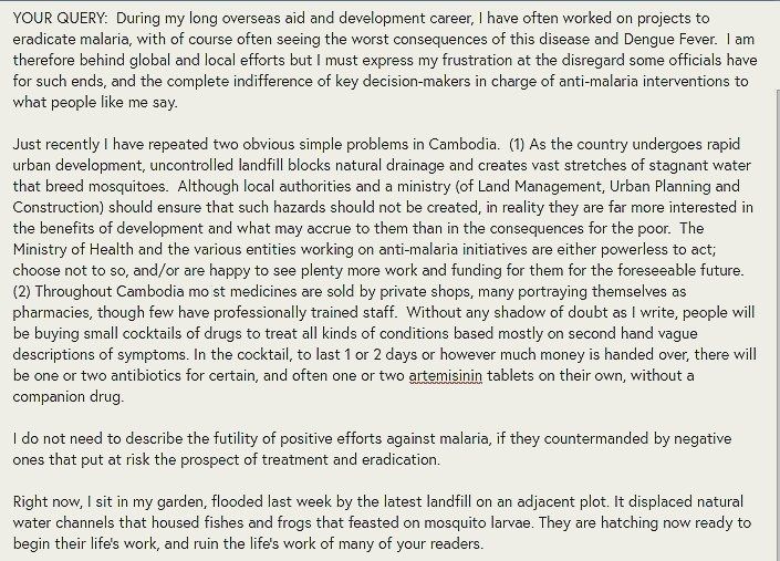 Not hyperbole: In Cambodia there is growing resistance to front-line drug treatment for Malaria, due largely to mis-use of anti-malarials and antibiotics. In addition simplest most obvious measures are not taken to prevent mosquitoes from breeding. Strange as it may seem all major health stakeholders - medical professions; administrators, global health bodies, donors and researchers are impervious to my warnings.
